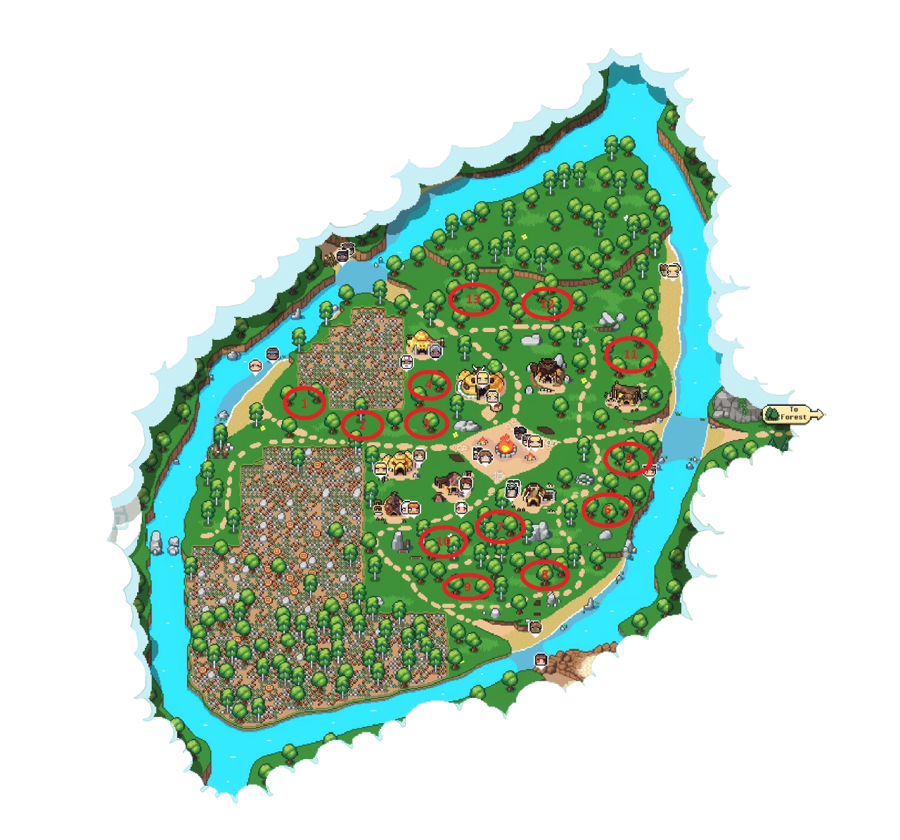 Village Structures are any structures that can be built outside of the farm fields. There are certain designated areas for Village Structures to be built (circled in red on the map).